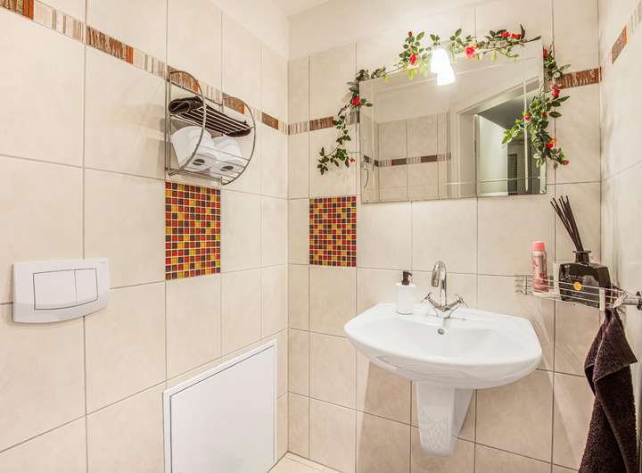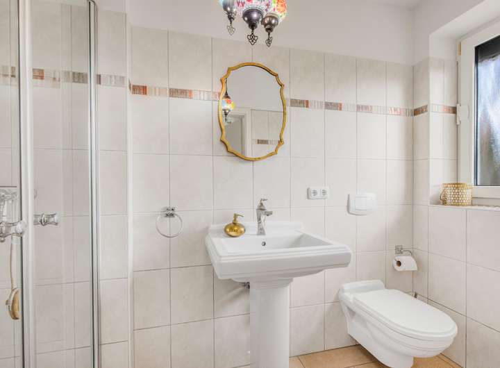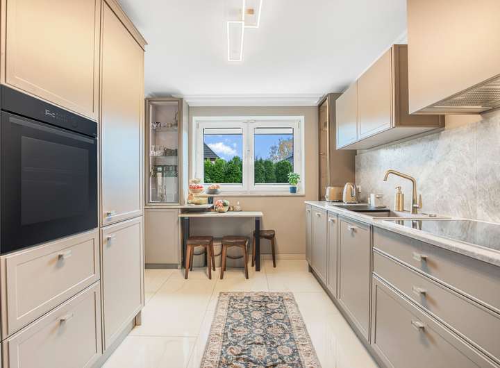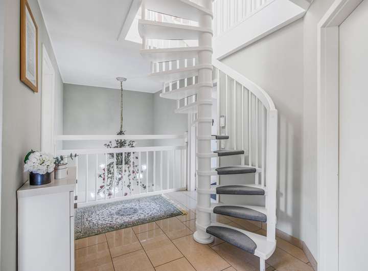 An kühleren Tagen schafft die Fußbodenheizung ein wohliges Raum. Wer einen Kamin einbauen lassen möchte, kein Problem, der Kaminzug ist dafür bereits vorbereitet. Der elegante helle Fliesenboden, teilweise mit schönen Mosaiken verbindet stilvolles Design mit pflegeleichter Handhabung und fügt sich harmonisch in das Gesamtbild des Hauses ein. Für zusätzlichen Komfort und Schutz sind die Fenster im Erdgeschoss mit Außenrollläden sowie einer sicheren Verriegelung ausgestattet, die optimale Sicherheit bietet. Darüber hinaus sorgt eine im Haus installierte Alarmanlage für ein hohes Maß an Sicherheit. Vom lichtdurchfluteten Flur gelangen Sie in die nahezu neue, in 2024 komplett neu eingebaute Nolte-Küche mit hochwertigen Markengeräten, hier werden alle Kochfreunde auf ihre Kosten kommen. Ein Gäste-WC mit Dusche ist vorhanden.