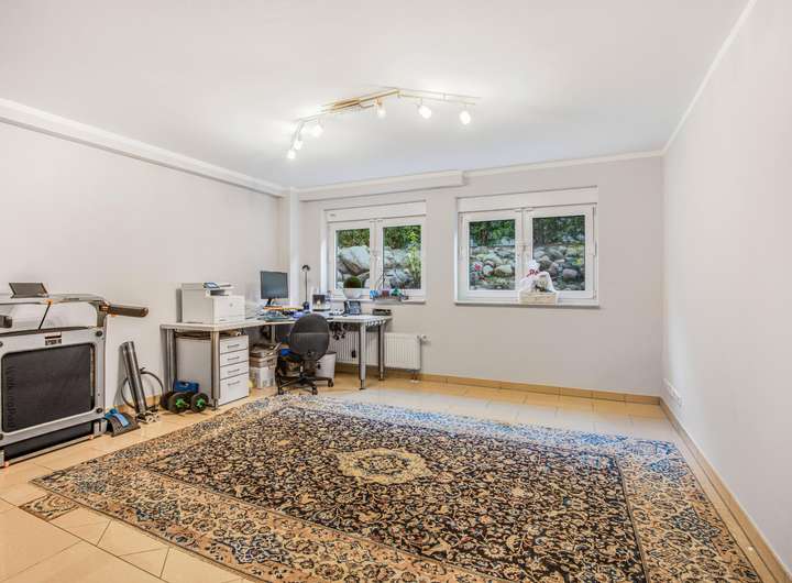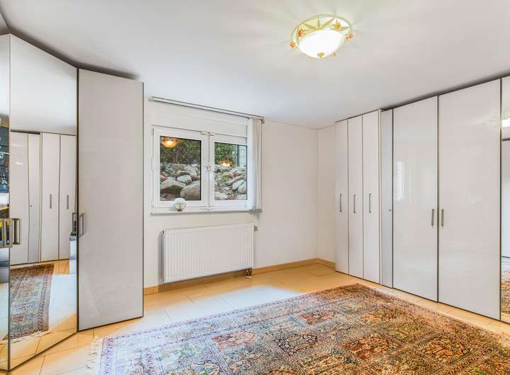 Im vollunterkellerten Bereich des Hauses finden Sie neben einem praktischen Hauswirtschaftsraum mit abgetrenntem WC ein vollwertiges, helles Zimmer von ca. 21 m² mit einer Deckenhöhe von ca. 2,45 m. Hier wurde das Erdreich abgeböscht, so dass auch dieses Zimmer (mit Küchenzeile) lichtdurchflutet ist - wie eine kleine Einliegerwohnung mit eigenem Eingang. Viel Nutzfläche befindet sich in einem weiteren, sehr hellen, wohnlich ausgebauten Raum mit ca. 18 m² sowie einem Abstellraum. Der gesamte Keller ist beheizt, teils durch eine Fußbodenheizung, teilweise durch Heizkörper. Alle Fenster sind Sicherheitsfenster und haben Rollläden.