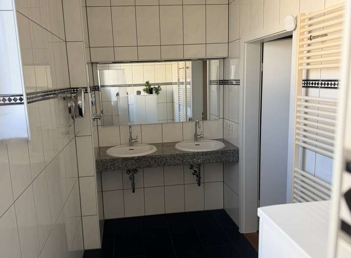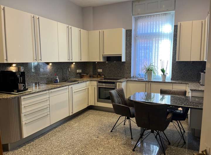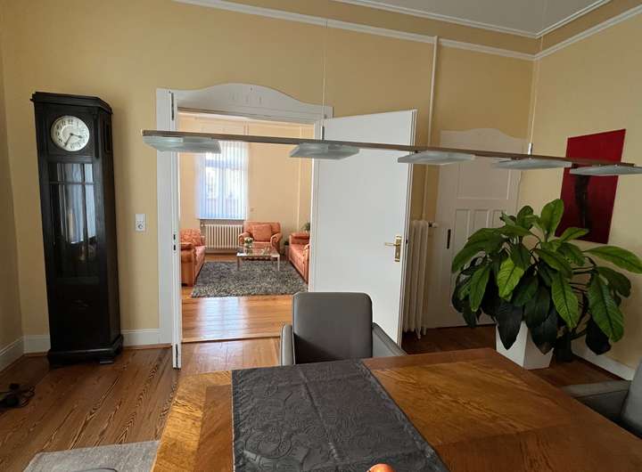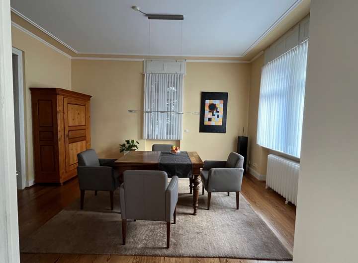 Im Erdgeschoss befinden sich neben der Küche, die einen direkten Zugang zu Hof/Garten ermöglicht bzw. als separater Eingang für das EG genutzt werden kann, eine Speisekammer, ein Duschbad, ein Gäste-WC, sowie drei großzügige repräsentative Räume, die vielfältig genutzt werden können.