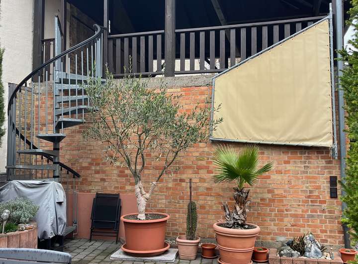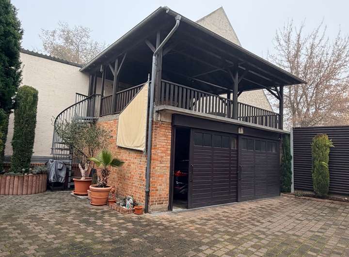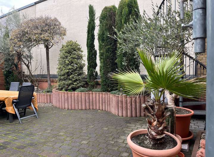 Im nahezu uneinsehbaren Hof des Anwesens befindet sich eine großzügige Doppelgarage mit überdachtem Freisitz. Ein pflegeleicht angelegter, kleiner toskanischer Garten rundet das überaus positive Gesamtbild ab.