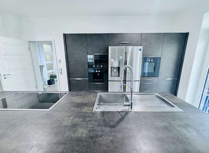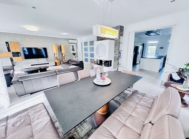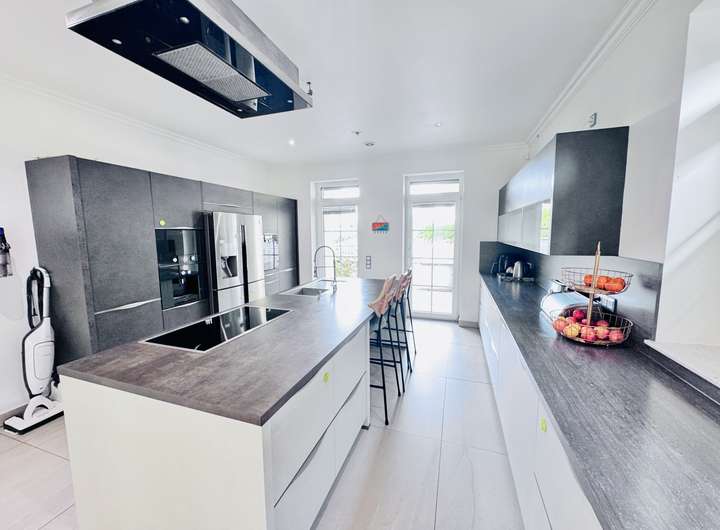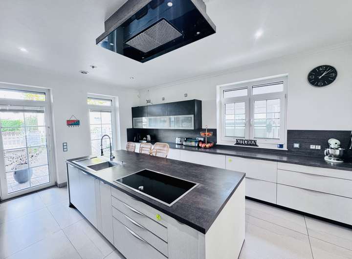 Die angrenzende Küche verbindet Design und Funktion auf hohem Niveau. Die große Kochinsel, die hochwertigen Geräte und die klare Gestaltung machen sie zum zentralen Treffpunkt des Familienlebens. Durch die direkten Zugänge zur Terrasse erweitert sich der Wohnraum an warmen Tagen mühelos nach draußen.