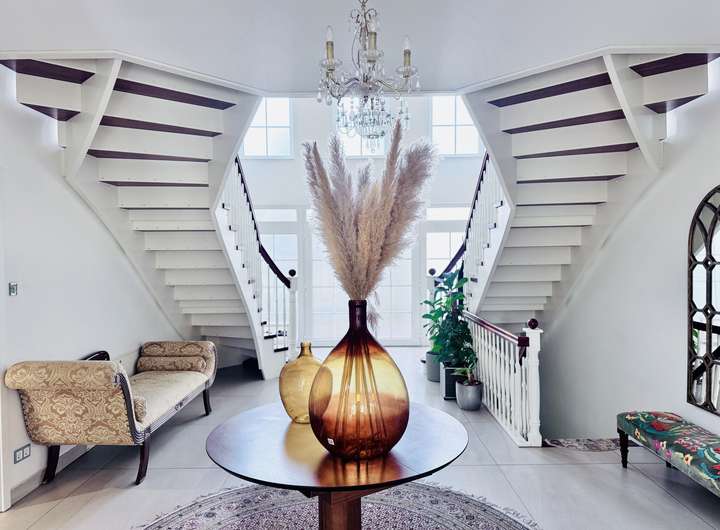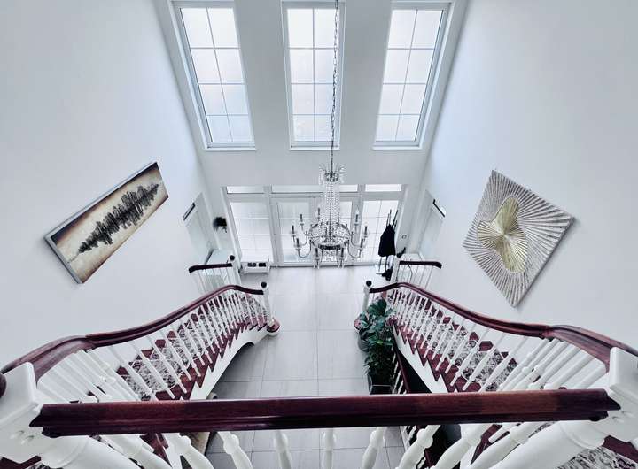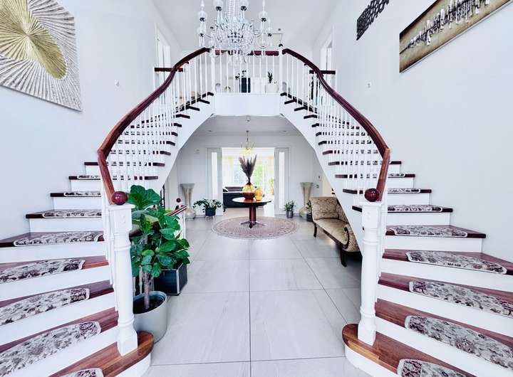 Das Entree des Hauses ist spektakulär und hat eine raumhohe Glasfront, flankiert von drei großformatigen Fenstern in voller Geschosshöhe, lässt das Tageslicht bis in die Tiefe des Hauses strömen. Die beeindruckende Doppeltreppe, die sich elegant und symmetrisch zu beiden Seiten emporwindet, verleiht dem Eingangsbereich eine einzigartige Großzügigkeit und erzeugt eine besondere Atmosphäre, die dem Haus seinen unverwechselbaren Charakter gibt. Der Kristalllüster, die feinen Details und die exklusive Materialwahl unterstreichen diesen besonderen ersten Eindruck und setzen das architektonische Konzept wirkungsvoll in Szene.