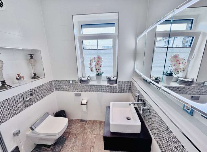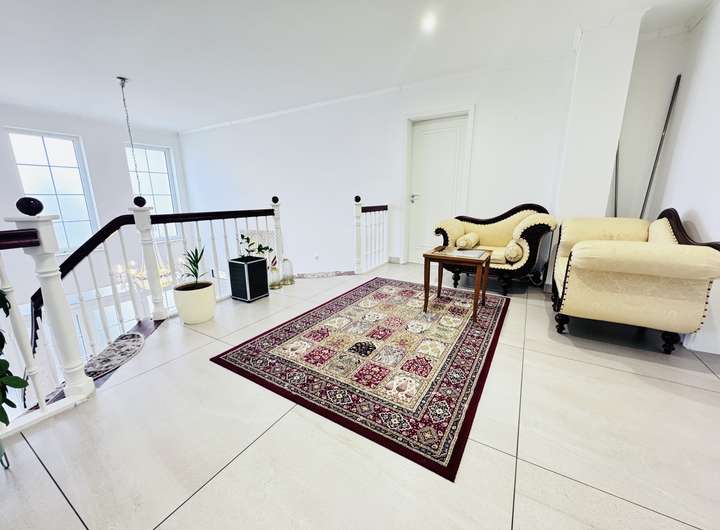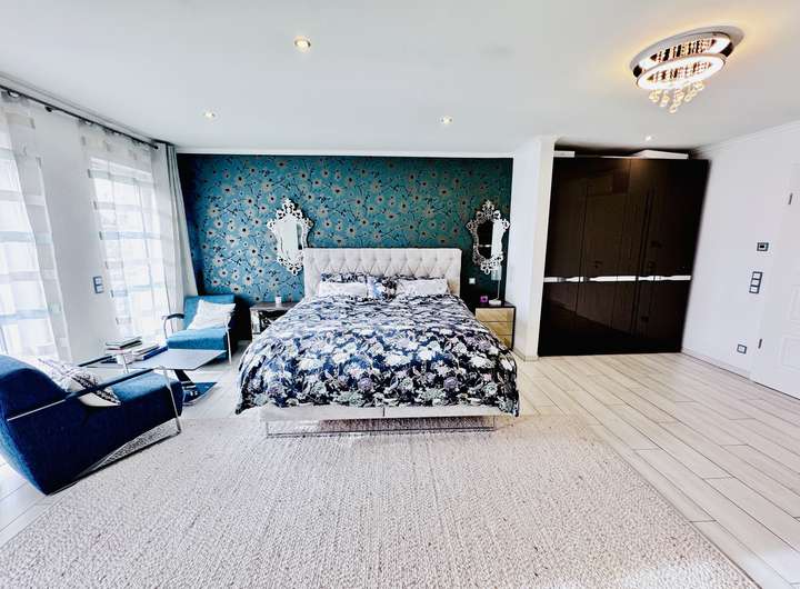Im Obergeschoss setzt sich der großzügige Stil des Hauses nahtlos fort. Die Galerie, die den Blick in die spektakuläre Eingangshalle ermöglicht, bildet einen hellen und repräsentativen Mittelpunkt dieser Ebene. Die Schlafzimmer sind großzügig bemessen, lichtdurchflutet und hochwertig ausgestattet. Das Hauptschlafzimmer bietet durch seine Größe, die Wandgestaltung und die großen Fensterflächen ein exklusives Wohnambiente. Angrenzend befindet sich ein eigenes Ankleidezimmer, über das man direkt in das private Badezimmer gelangt. Die Bäder bestechen durch ihre moderne Ausstattung, großformatige Fliesen, stilvolle Dekoelemente und hochwertige Sanitäranlagen. Die bodengleichen Duschen, breiten Waschtische und die geschmackvolle Beleuchtung sorgen für ein luxuriöses Wohlfühlerlebnis.