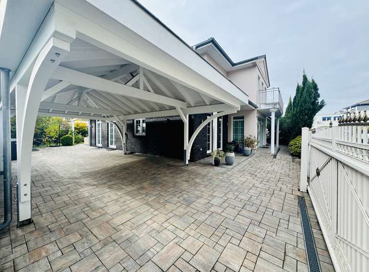 Diese beeindruckende Stadtvilla präsentiert sich als ein repräsentatives Einfamilienhaus, das in seiner architektonischen Gestaltung, Großzügigkeit und Ausstattung weit über das hinausgeht, was man üblicherweise auf dem Immobilienmarkt findet. Das Haus beeindruckt mit einer Gesamtwohlfühlfläche von etwa 470 m², die sich auf drei großzügig gestaltete Wohnetagen verteilen. Bereits beim Betreten des Grundstücks wird deutlich, dass hier mit höchstem Anspruch geplant und gebaut wurde. Die elegante Einfahrt, das weitläufige, hochwertig gepflasterte Areal und der imposante, massiv errichtete Carport bilden den stilvollen Auftakt eines außergewöhnlichen Wohnensembles.