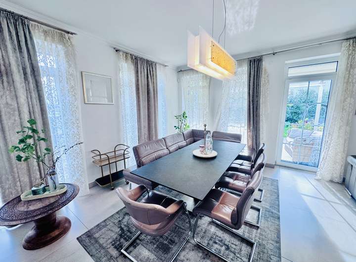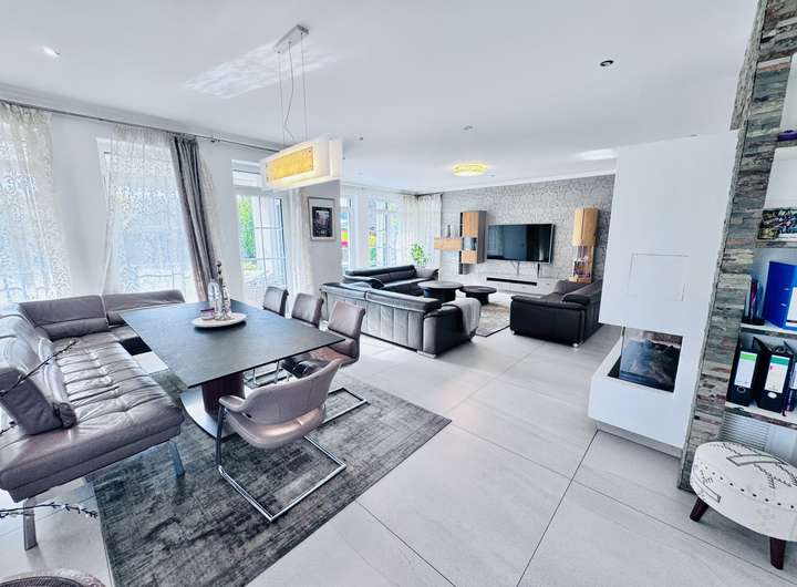 Der Wohnbereich im Erdgeschoss ist großzügig gestaltet und öffnet sich mit breiten Glasflächen zur Sonnenseite des Gartens. Edle Bodenbeläge, moderne Wandgestaltungen und eine hochwertige Innenausstattung sorgen für eine warme Atmosphäre, die trotzdem klar und elegant bleibt. Wohn- und Essbereich gehen harmonisch ineinander über und bieten reichlich Platz für große Möbelkonzepte. Ein moderner Ethanol-Kamin setzt einen ruhigen Mittelpunkt und erhöht den Wohnkomfort.
