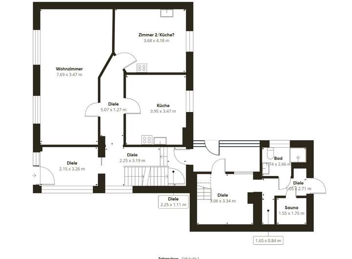 Der Schnitt des Hauses ist äußerst vorteilhaft. So bietet sich im Erdgeschoss ein weiträumiger Wohnbereich, der mit Entfernen einer nicht tragenden Wand oder eines Durchbruchs mit der Küche zu einem großen Wohn- und Essbereich fusioniert werden kann. Badezimmer befinden sich sowohl im Obergeschoss des Haupthauses sowie im Erdgeschoss des Anbaus. Im Obergeschoss des Haupthauses befindet sich zudem der Schlafbereich mit drei großzügig geschnittenen Zimmern, die ebenso als Hobbyraum oder Home Office genutzt werden können.