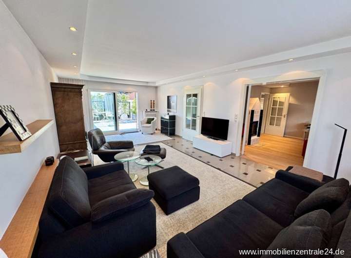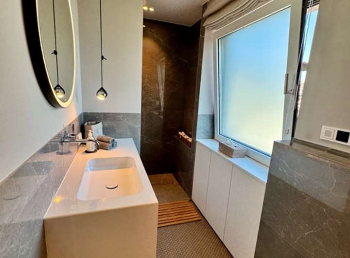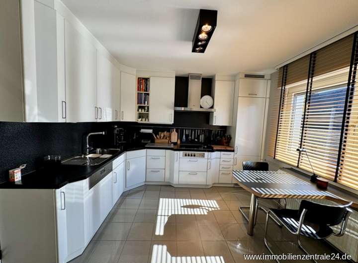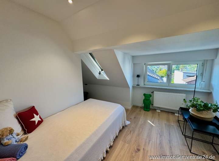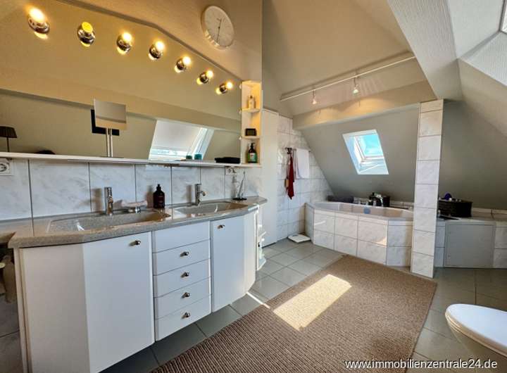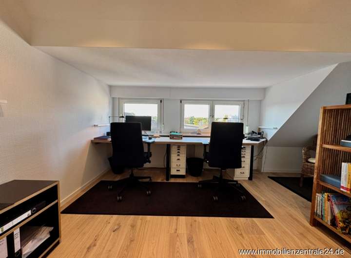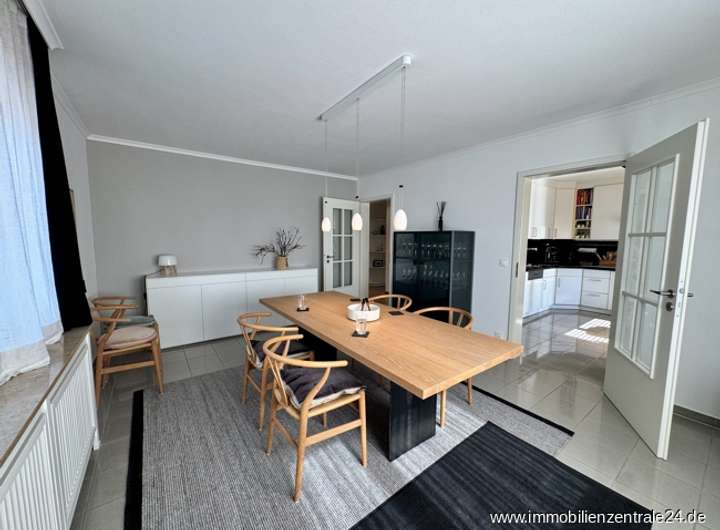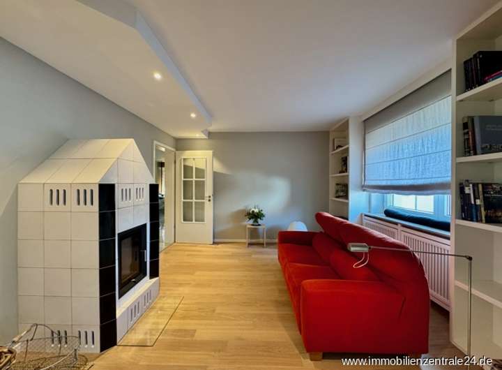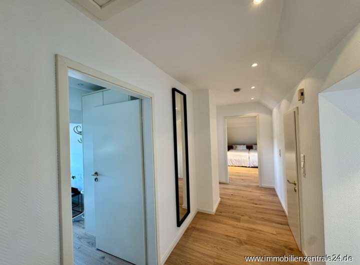 Der Wohnbereich erstreckt sich über das erste Obergeschoss und das Dachgeschoss. Über die einladende Diele im Erdgeschoss gelangt man in das erste Obergeschoss, das mit seiner durchdachten Raumaufteilung und der hellen Atmosphäre besticht. Hier befinden sich das Esszimmer, das gemütliche Kaminzimmer sowie das Wohnzimmer mit direktem Zugang zur großen, sonnigen Dachterrasse – ein idealer Ort zum Entspannen und Genießen. Die separate Küche ist mit einer modernen Einbauküche und hochwertigen Markengeräten ausgestattet. Ein neuwertiges Duschbad aus dem Jahr 2019 rundet diese Etage perfekt ab.