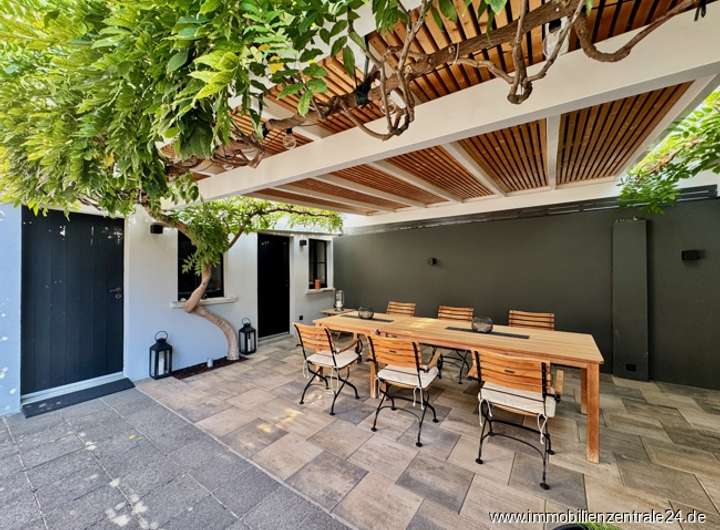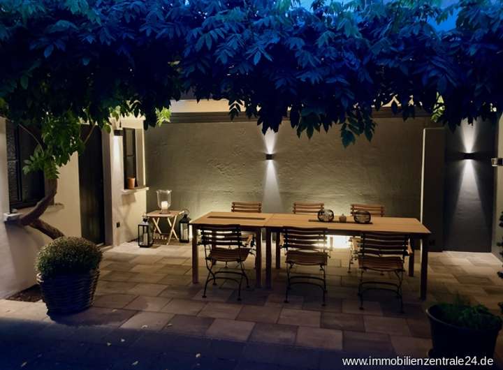Das Außenareal überzeugt mit einer gepflegten Gestaltung: Eine Garage bietet Platz für ein Fahrzeug, zwei praktische Anbauten im Hof sorgen für zusätzlichen Stauraum, und eine charmante Gartenlaube lädt zum Verweilen im Grünen ein.