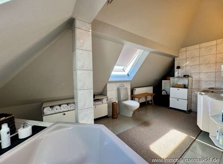 Im Dachgeschoss erwarten Sie drei komfortable Schlafräume, ein modernes Badezimmer mit Eckbadewanne sowie ein praktischer Abstellraum. Mit einer Gesamtwohnfläche von rund 174,81 m² bietet dieses Haus reichlich Platz für die ganze Familie.