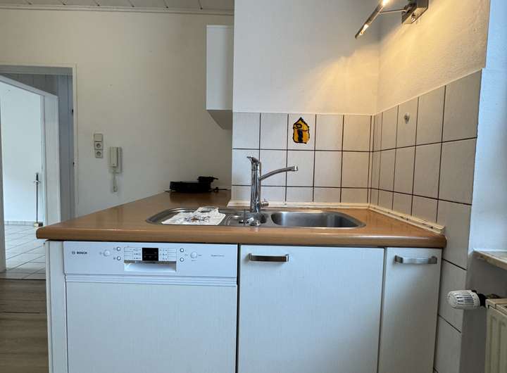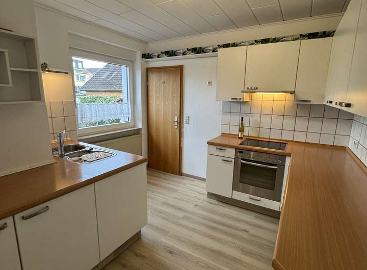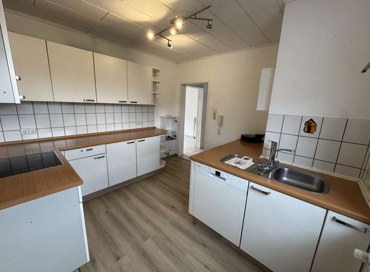 Die angrenzende Küche (inkl. Einbauküche und Zusatzelementen) ist geräumig und modern ausgestattet.