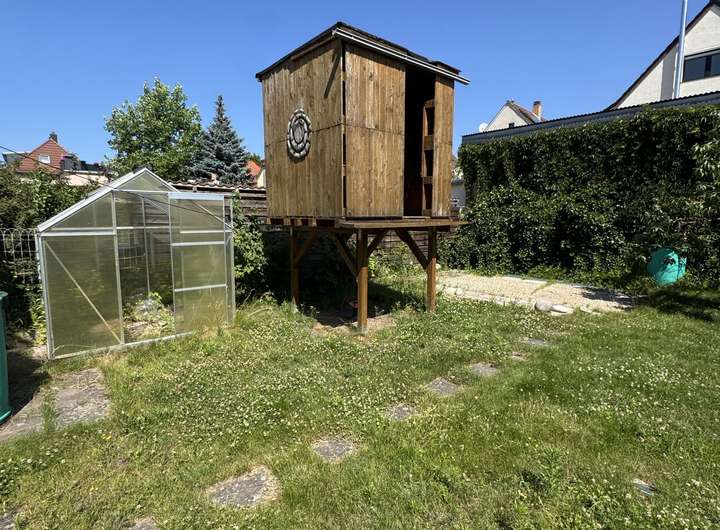 Der große Garten erstreckt sich auf ca. 150 qm Gartenfläche und ist das Herzstück der Immobilie. Er bietet nicht nur ausreichend Platz für Erholung und Freizeit, sondern hat auch viele Besonderheiten, wie ein Spielhaus, ein Gewächshaus, einen Gartenteich und einen Grillplatz. Auch ein Pool kann hier aufgestellt werden.