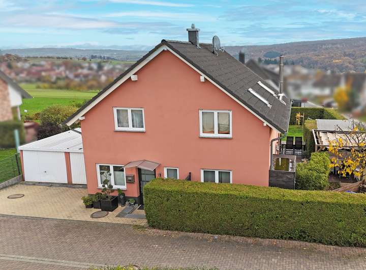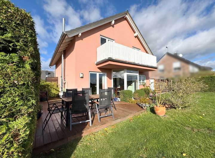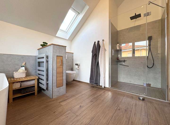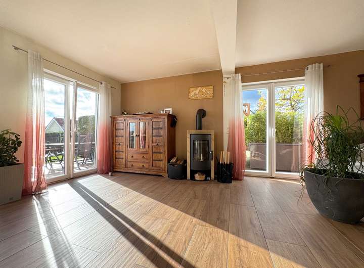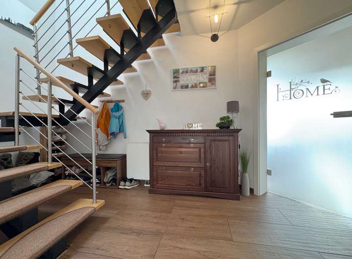 Erbaut im Jahr 2003, empfängt Sie das Haus mit einer warmen Atmosphäre. Das gesamte Erdgeschoss ist mit Fliesen in Holzoptik ausgestattet. Besonders hervorzuheben ist das kürzlich im Chalet-Stil modernisierte Gäste-WC, das 2021 erneuert wurde. Auf dieser Ebene befindet sich auch der Hausanschlussraum, in dem die Möglichkeit besteht, eine Waschmaschine anzuschließen, sowie der lichtdurchflutete Wohnbereich, der durch den Flur zugänglich ist. Große Fenster lassen reichlich Tageslicht herein und sorgen für ein angenehmes Raumklima. Zwischen dem großzügigen Wohn- und dem Essbereich, der sich in einem einladenden Erker befindet, sorgt ein Kamin gerade in der Übergangszeit für wohlige Wärme.