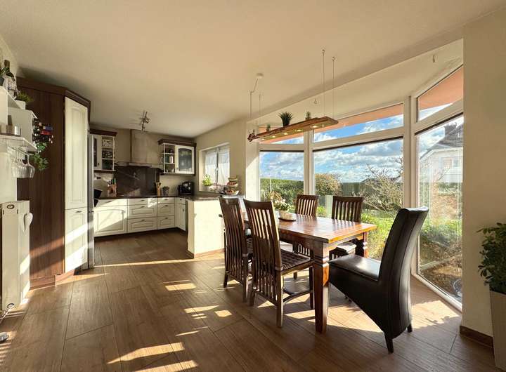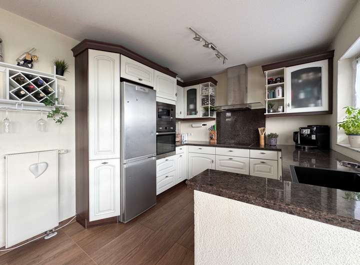 Die offene Küche im charmanten Landhausstil schließt sich direkt an den Essbereich an. Von hier aus gelangen Sie durch mehrere Fenstertüren auf die teilweise überdachte Terrasse mit einem Grillkamin, die zu einem großen Garten führt – ein idealer Platz für Kinder, um sich auszutoben.