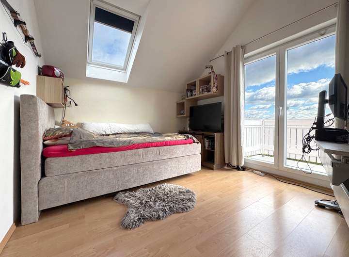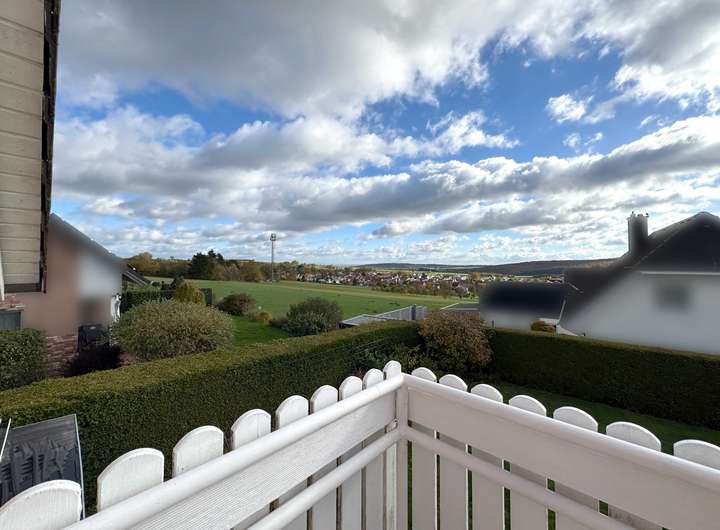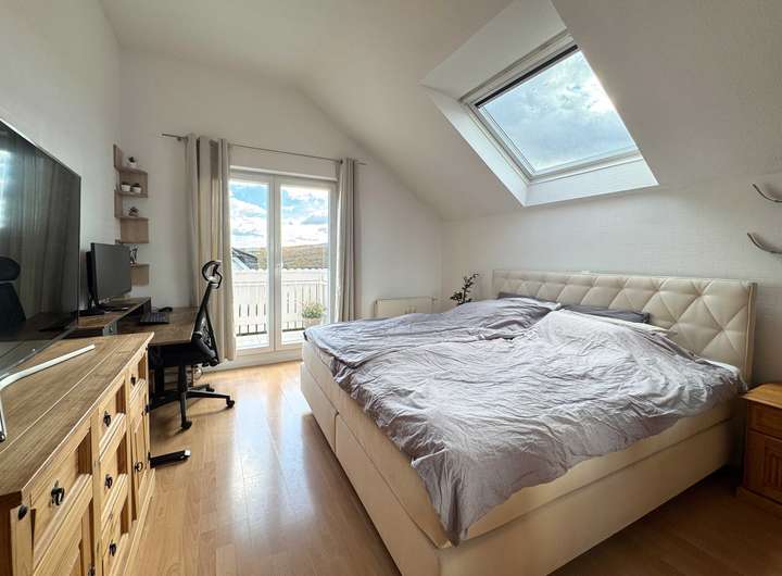 Eine Treppe im Flur führt ins Obergeschoss, wo sich drei gemütliche Schlafzimmer befinden. Zwei der Zimmer verfügen über einen Balkon, der nach Osten ausgerichtet ist, und laden dazu ein, die Morgensonne und den herrlichen Blick in den Taunus zu genießen. Das Obergeschoss ist mit praktischem Laminatboden versehen. Das Badezimmer wurde 2023 stilvoll erneuert und bietet sowohl eine Dusche als auch eine großzügige Badewanne.