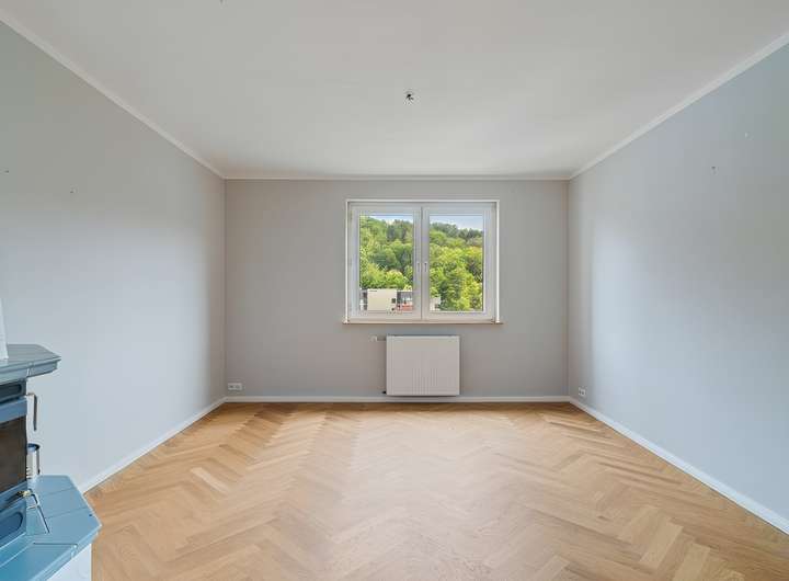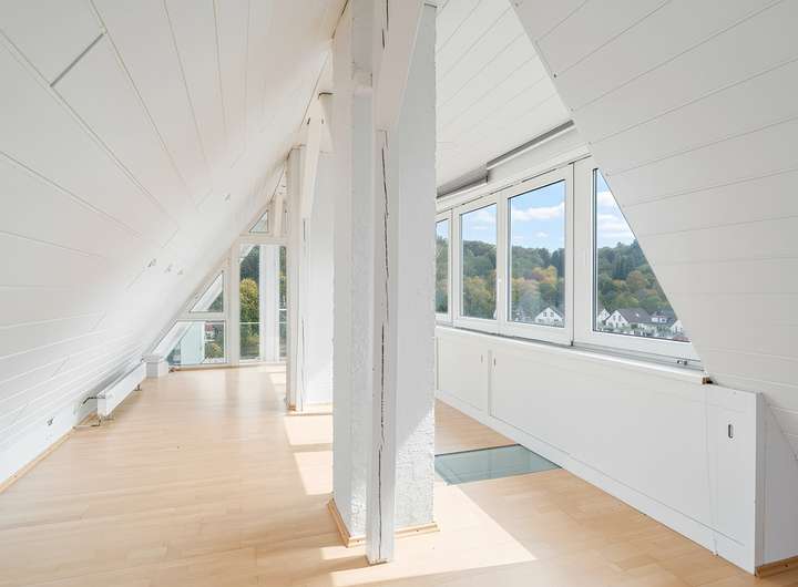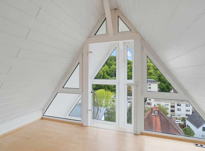 Die Treppe ins Obergeschoss ist mit Granit belegt und fügt sich harmonisch ins Gesamtbild ein. Hier stehen drei Zimmer und ein Abstellraum zur Verfügung. Über eines der Zimmer führt eine offene Treppe mit beeindruckender Fensterfront in das ausgebaute Dachgeschoss, das 1997 zu einer lichtdurchfluteten Galerie umgestaltet wurde. Die großflächige Verglasung sorgt für ein außergewöhnliches Raumgefühl und einen herrlichen Ausblick. Durch eine Glastür lässt sich der Bereich abtrennen und flexibel als Büro, Gästezimmer oder Rückzugsort nutzen. In den oberen Räumen ist ebenfalls Parkettboden verlegt.