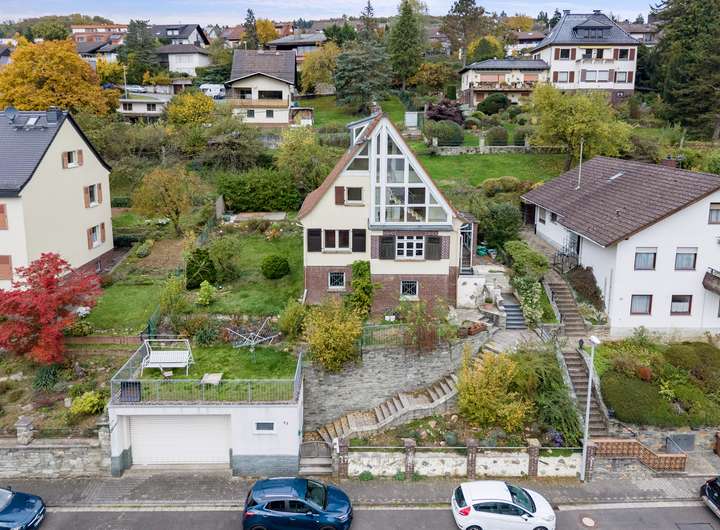 In bevorzugter Hanglage von Eppstein-Vockenhausen präsentiert sich dieses charmante Einfamilienhaus aus dem Jahr 1936 mit herrlichem Blick ins Tal und viel Sonne durch die ideale Südausrichtung. Das Haus verfügt über eine Wohnfläche von ca. 144 m² und ist vollständig unterkellert. Durch die Hanglage liegt das Untergeschoss jedoch nicht im Erdreich und kann vielseitig genutzt werden. Über eine Treppe gelangt man vom Straßenniveau zum Eingangsbereich, wo ein kleiner Windfang den Zugang zum Haus sowie zum hinteren Gartenteil bietet. Der Garten ist terrassenförmig angelegt und bietet auf verschiedenen Ebenen gemütliche Sitzmöglichkeiten. Im oberen Bereich lädt eine schöne Holzterrasse mit Blick zum Entspannen ein.