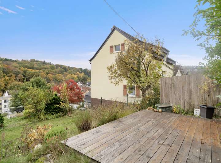 - Mehrere Terrassenebenen im Garten, darunter große Holzterrasse mit Ausblick