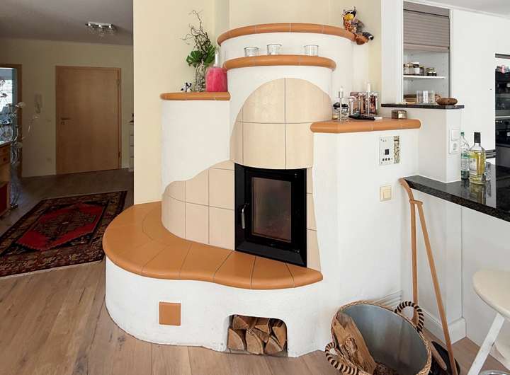 Kachelofen (EG, elektrisch steuerbar) und Kaminofen (DG) für behagliche Wärme
