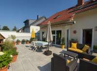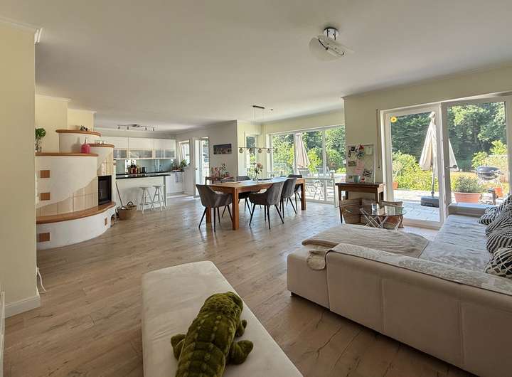 Die Hauptwohnung im Erdgeschoss begeistert mit einem durchdachten Grundriss und einer hochwertigen Ausstattung. Zwei gut geschnittene Schlafzimmer, ein modernes Tageslichtbad mit Wanne und Dusche sowie ein separates Gäste-WC bieten besten Wohnkomfort. Herzstück der Wohnung ist der offen gestaltete Wohn- und Essbereich mit ca. 40 m² Fläche sowie die angrenzende, elegante Einbauküche mit edler Granitarbeitsplatte. Für besondere Wohlfühlatmosphäre sorgt ein stilvoller, elektrisch gesteuerter Kachelofen im Wohnbereich. Von hier aus gelangen Sie auf die beeindruckende, fast 50 m² große Terrasse mit direktem Zugang zum liebevoll angelegten Garten – eine wahre Wohlfühloase in unvergleichlicher Naturlage.