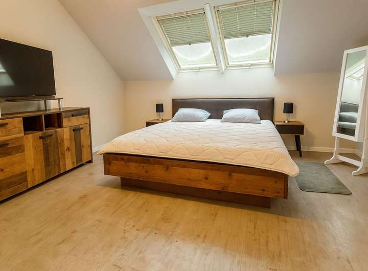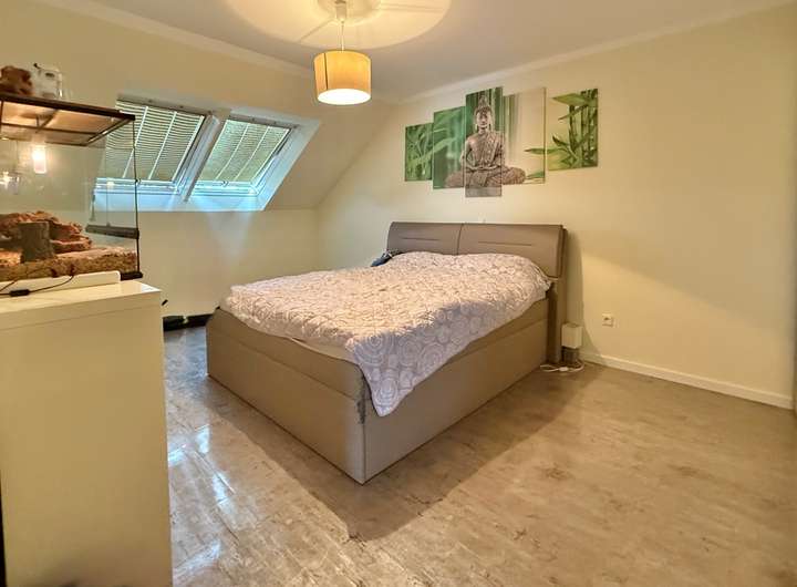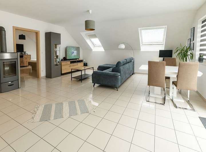 Im Dachgeschoss befindet sich eine weitere attraktive 3-Zimmer-Wohnung mit Küche, Bad, separatem WC und Balkon. Auch hier ist eine moderne Einbauküche vorhanden. Ein Kaminofen im Wohnbereich schafft ein angenehmes Ambiente. Die Wohnung ist derzeit vermietet und erzielt monatliche Mieteinnahmen in Höhe von 1.300 EUR. Über der Wohnung befindet sich ein geräumiger Spitzboden mit Ausbaupotenzial, der aktuell als Abstellfläche genutzt wird.