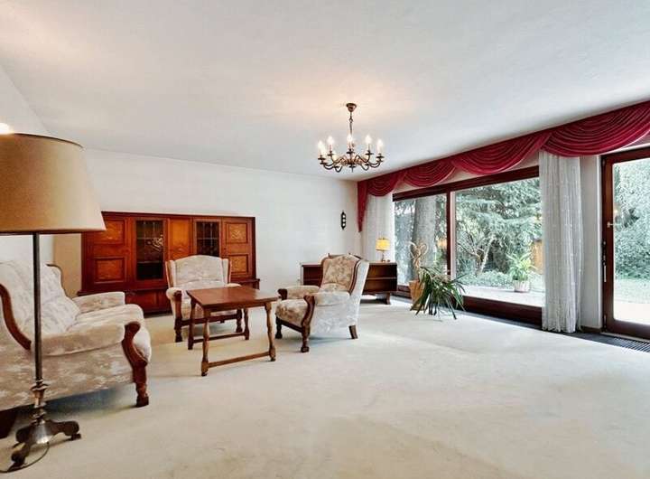 Bereits im Erdgeschoss beeindruckt das ca. 38 m² große Wohnzimmer mit viel Tageslicht und einem offenen Kamin. Direkt angrenzend liegt das Esszimmer, das genug Platz für eine große Familie oder gesellige Runden bietet.