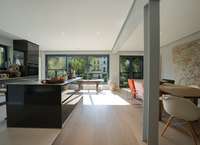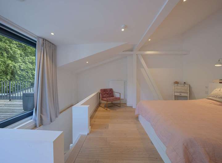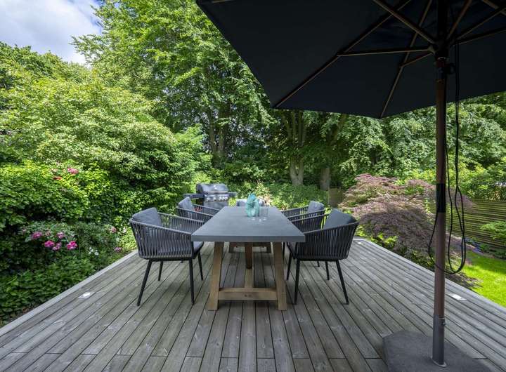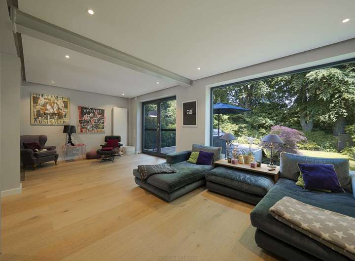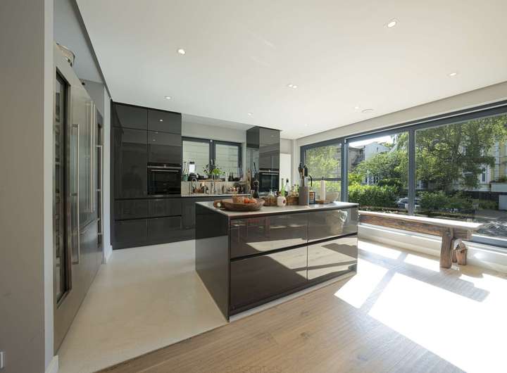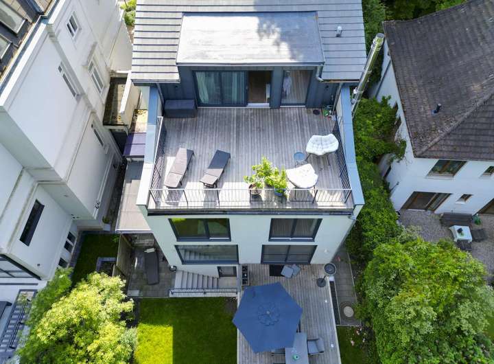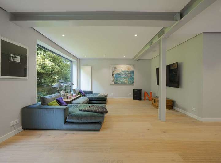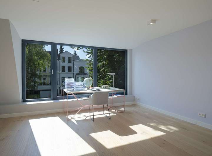 Bodentiefe Fenster, massive Dielen und eine maßgefertigte Ausstattung schaffen ein Wohngefühl, das Design und Geborgenheit perfekt verbindet. Eine große Dachterrasse mit Blick in den Garten, der an den Fischers Park grenzt.