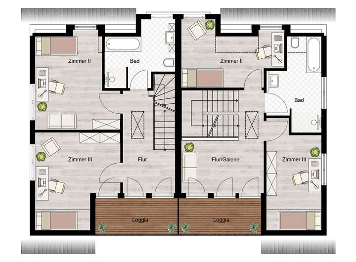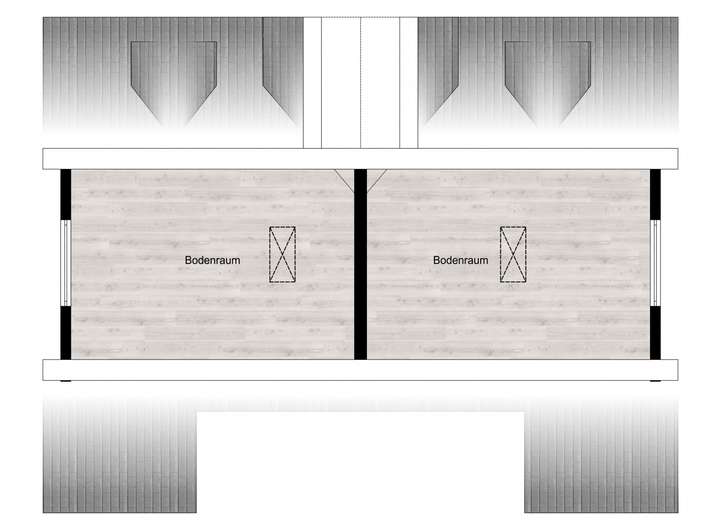 Durch die großzügigen Fensterflächen erhält das Untergeschoss genügend Tageslicht und kann vielseitig genutzt werden (z.B. weitere Schlafzimmer, Büro oder Gästezimmer). Zusätzlich gibt es ein großes Duschbad mit Ankleide und einen Hauswirtschaftsraum mit Anschlussmöglichkeit für eine Waschmaschine und einen Trockner. Die Geschosstreppe zwischen Unter- und Erdgeschoss wird als Betontreppe ausgeführt und der Raum darunter kann als zusätzlicher Abstellraum genutzt werden. Im Obergeschoss sind zwei Schlafzimmer und ein Vollbad mit Dusche und Badewanne geplant. Zusätzlich gibt es eine Dachloggia mit Ausrichtung nach Süden, die vom Flur abgeht. Der Dachboden ist nicht ausgebaut. Er kann aber über eine Auszugstreppe als Abstellfläche genutzt werden.