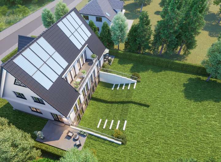 Im Erdgeschoss entsteht ein geräumiges Wohn- und Esszimmer mit offener Küche und angrenzender Süd-West-Terrasse. Durch großzügige Fensterflächen und einer optimalen Ausrichtung erreicht viel Tageslicht den Wohn- und Essbereich. Der Wohnbereich im EG hat eine lichte Raumhöhe von ca. 2,65 m. Das wohnliche Untergeschoss wird an der Südseite vollständig freigegraben, so dass von dort ebenfalls ein direkter Austritt in den Garten möglich ist. Eine Besonderheit des Objektes ist der große und lang gestreckte Garten.