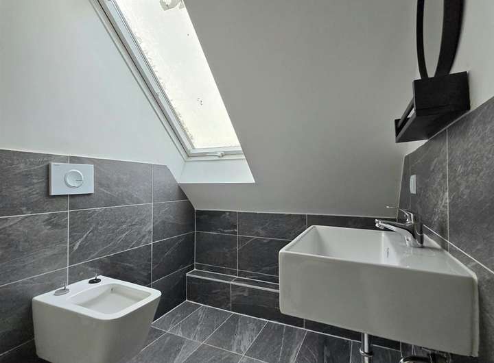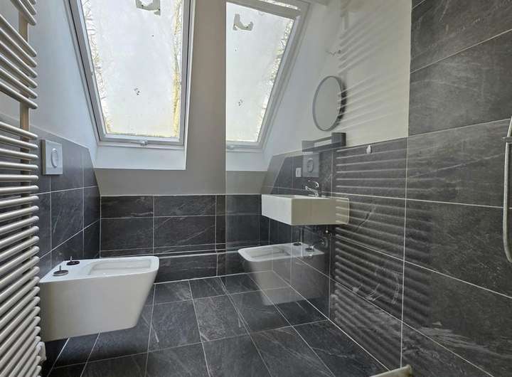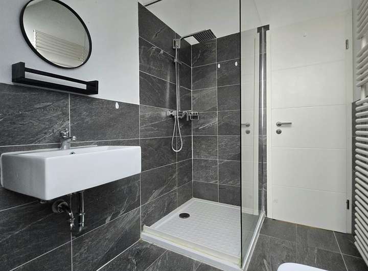 - modernes Duschbad mit Fenster, Glasduschwand und Regendusche, eckiges wandhängendes WC und Waschtisch sowie Handtuchhalterheizkörper