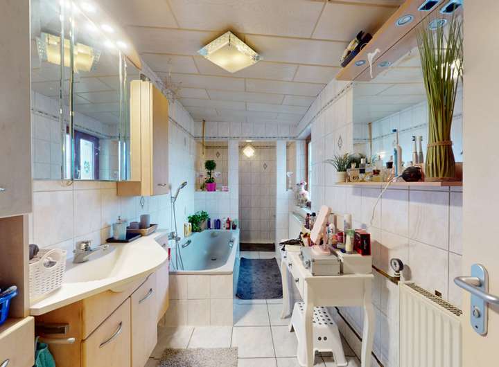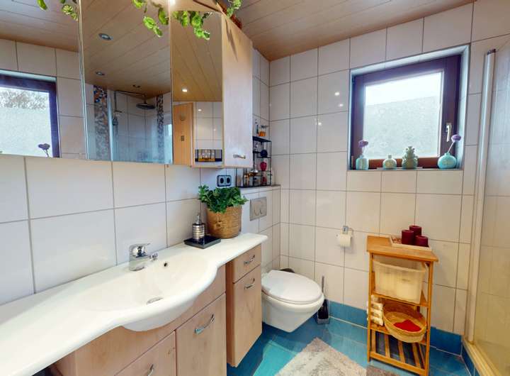 Im Obergeschoss befindet sich außerdem noch ein großes Badezimmer, welches mit Dusche, WC und Waschbecken ausgestattet ist.
