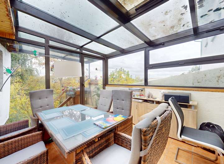 Ebenso gelangt man von der Küche aus, auf direktem Wege in den Wintergarten. Dieser ist perfekt für einen Spieleabend oder auch für ein gemütliches Zusammensein mit Freunden und Familie.