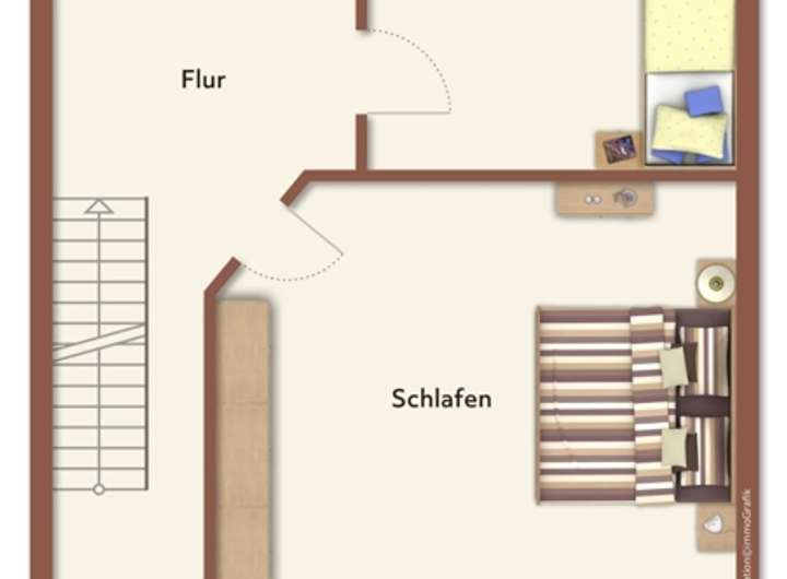 Im Obergeschoss befinden sich zwei helle Schlafzimmer, die jeweils ausreichend Platz für Doppelbetten und Schränke bieten.