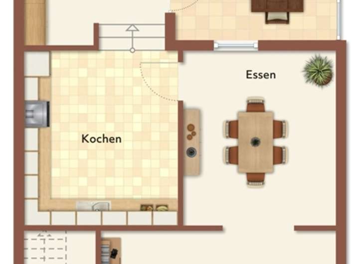 Anschließend befindet sich der einladende Essbereich, der durch seine offene Gestaltung direkt mit der Küche verbunden ist.