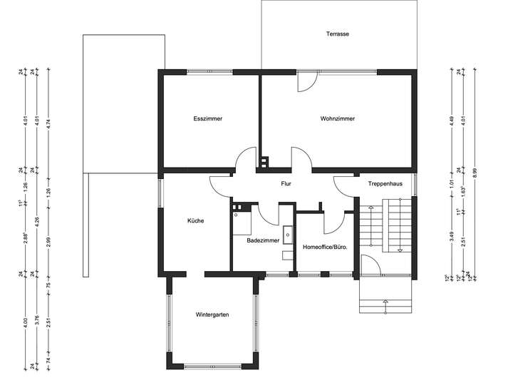 Das Wohnhaus ist quasi in 2 Wohnungen aufgeteilt, davor gelagert ist das großzügige Treppenhaus, sodass jede der Wohnungen auch separat nutzbar sind. Die Wohnung im Erdgeschoss ist aufgeteilt in eine 4-Zimmerwohnung mit einem erst vor wenigen Jahren modernisierten Tageslicht-Duschbad und mit Zugang vom Wohnzimmer auf die große uneinsehbare Süd-Terrasse und in den parkähnlichen Garten.