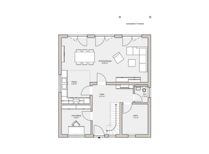 Betreten Sie das Familienhaus Jano über den überdachten Eingangsbereich sowie die helle Diele, die mit 15 Quadratmetern Bewohnern und Gästen bereits die Offenheit dieses Massivhauses zeigt. Von der Diele aus gelangen Sie in alle Räume des Erdgeschosses: Home-Office, Gäste-WC sowie Hauswirtschaftsraum. Highlight im Erdgeschoss ist der offene Wohn- und Essbereich mit Küche. Über drei bodentiefe Fensterelemente haben Sie Zugang in Ihren Garten. Jano bietet auch bei regnerischem Wetter die Möglichkeit, draußen zu sitzen – durch eine überdachte Terrasse.