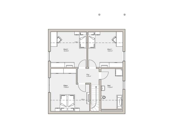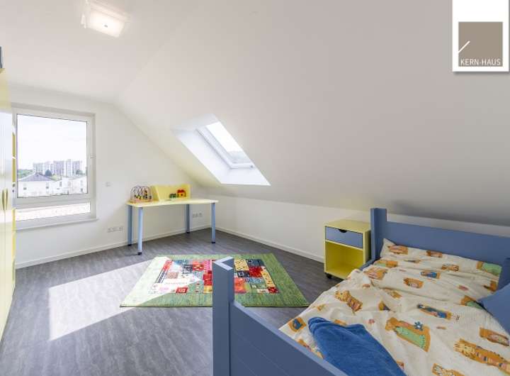 Im Dachgeschoss befinden sich zwei nahezu gleich große Kinderzimmer, ein Elternschlafzimmer sowie ein Badezimmer für die Familie.