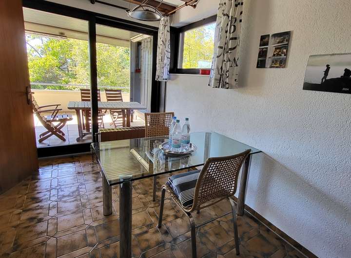 -Küche mit großer Stellfläche und kleinem Essbereich und Zugang zur Außensitzgruppe auf dem Balkon.