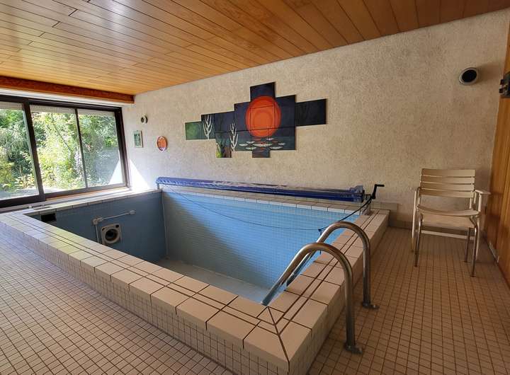 -Schwimmhalle mit Saunabereich im Gartengeschoß mit Zugang zur Terrasse.