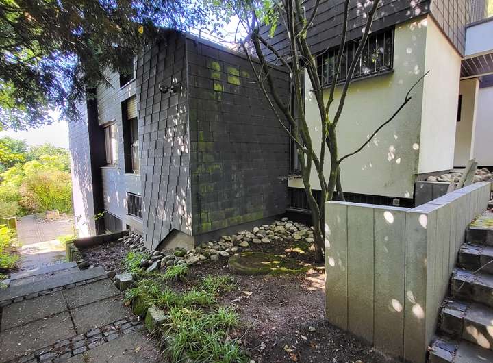 -Massiv gebautes Architektenhaus mit gedämmter Putzfassade. Dacheindeckung und Außenwandverkleidungen aus schwarzem Kunstschiefer (Faserzement).