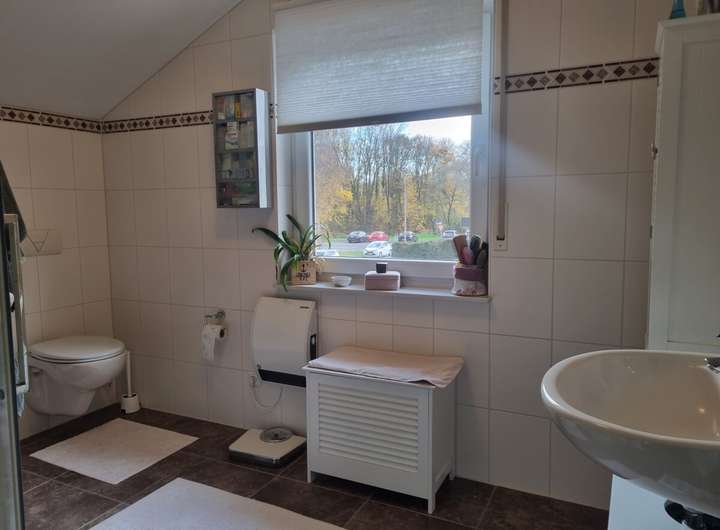 Das Bad ist modern gestaltet und verfügt über funktionale Armaturen.
