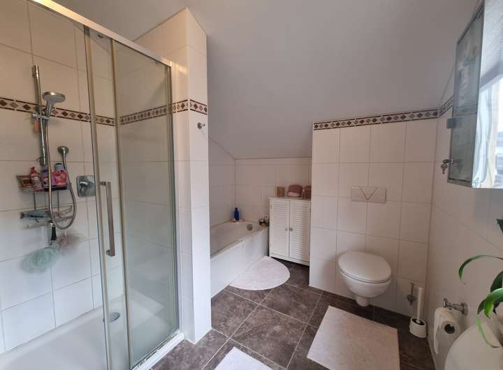 Das Obergeschoss: Drei Schlafzimmer in unterschiedlichen Größen, Idealaufteilung für Elternschlafzimmer, Kinderzimmer und Arbeitsbereich; Badezimmer mit Dusche und Badewanne.