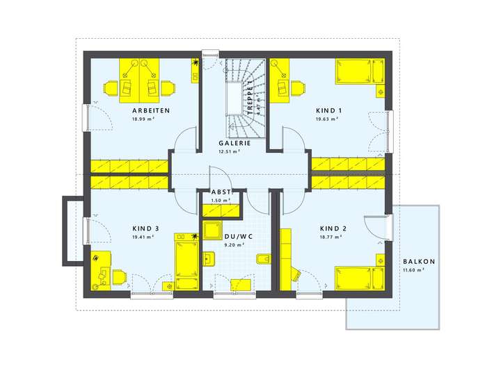 Die besondere Architektur überzeugt durch ein modernes Satteldach mit vollwertiger Raumhöhe im Obergeschoss. Zwei großzügige Erker mit Panoramafenstern sorgen für eine lichtdurchflutete Atmosphäre und schaffen zusätzlichen Wohnraum, besonders in den Schlafzimmern. Ein ansprechender Balkon rundet das architektonische Konzept ab.