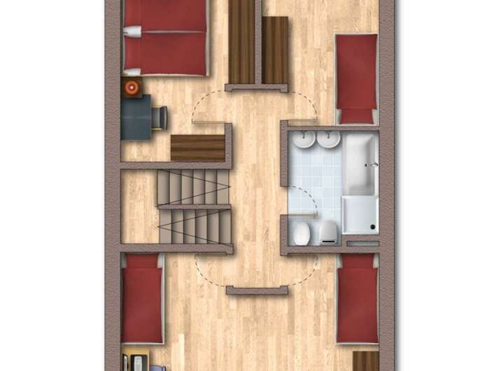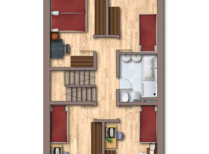 Besonders hervorzuheben ist die offene, großzügige Raumaufteilung, die durch das Flachdach, die klare Architektur und die Hausbreite von 6,5 Metern unterstützt wird. Im Obergeschoss besteht die Möglichkeit, drei oder vier Schlafzimmer einzurichten, je nach persönlichem Bedarf (siehe Grundriss mit Alternative).