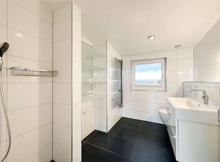 Das Obergeschoss überzeugt mit einem beeindruckenden Studio (ca. 20 m²), das dank raumhoher Glasflächen und Schiebetür zum Balkon fast loftartige Großzügigkeit ausstrahlt. Der Blick von hier über den Riedsee ist atemberaubend – im Sommer wie im Winter. Ein hochwertig ausgestattetes Tageslichtbad mit Überkopfdusche, Blick auf See und Bergstraße sowie ein separates Schlafzimmer ergänzen das Ensemble.
