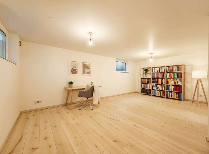 Das Untergeschoss bietet einen großen, hellen Raum, der weit mehr ist als nur Abstellfläche – ideal etwa als Fitness-, Hobby- oder Wellnessbereich. Ein separater Technikraum mit Wärmepumpe, modernem KNX-Bussystem, Lüftungsanlage, Netzwerkverteilung sowie Waschmöglichkeiten zeigt, wie durchdacht und technisch anspruchsvoll das Haus geplant wurde.