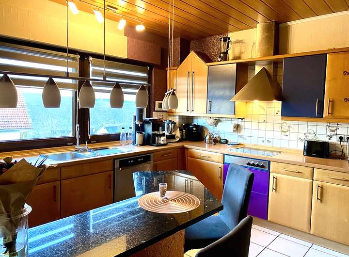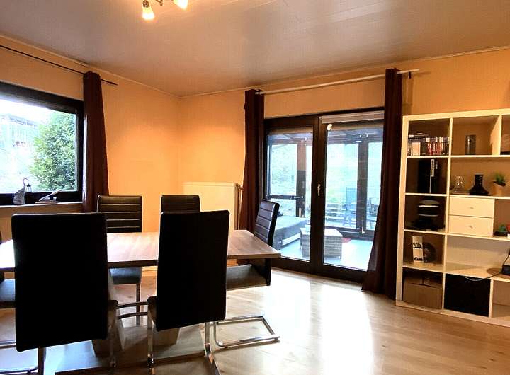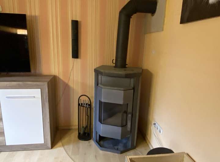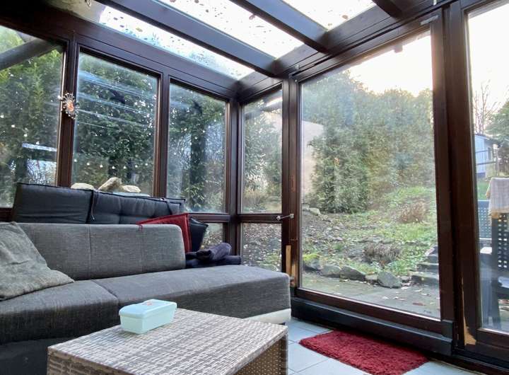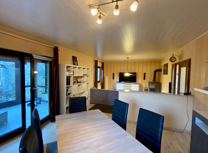 Im großen Wohn-Esszimmer sorgt der Kaminofen für eine behagliche Atmosphäre. Der Wintergarten erweitert den Wohnraum und bietet einen herrlichen Blick in den Garten.