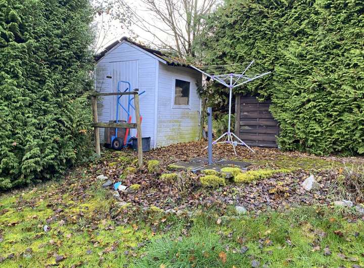 Ein kleines Gartenhaus bietet Ihnen Stauraum für Ihre Gartengeräte.