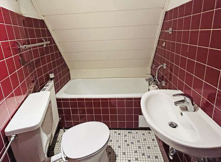 weinrot gefliestes Vollbad mit weißen Sanitärobjekten im DG