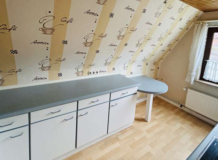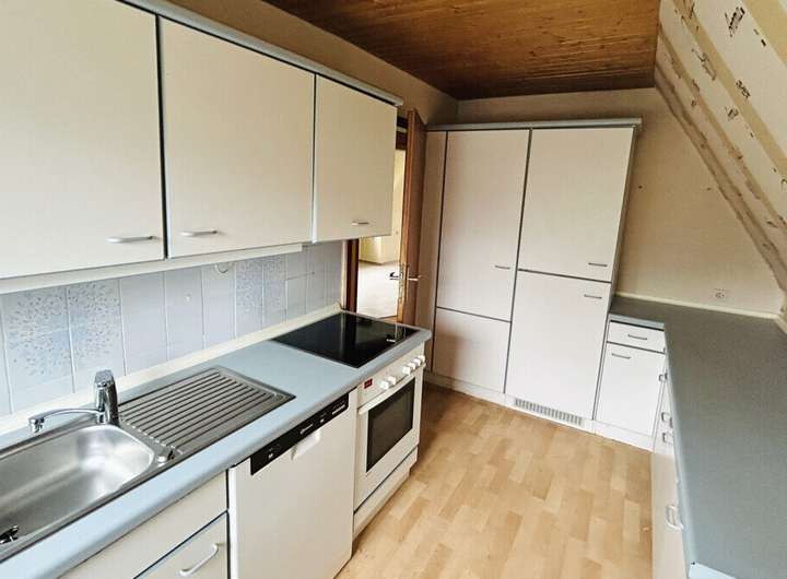 helle Einbauküche mit E-Herd, Kochfeld und Kühlschrank im DG