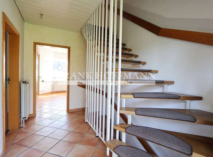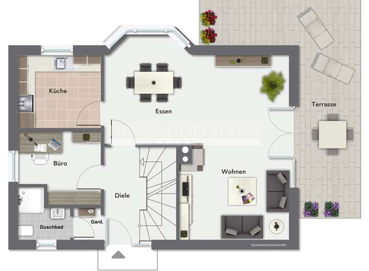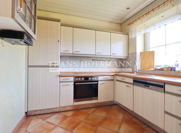 Im Erdgeschoss erwartet Sie ein einladendes Wohnzimmer mit Kamin, das als stilvoller Trenner zwischen Wohn- und Essbereich dient. Ein lichtdurchfluteter Erker im Essbereich und eine angrenzende, voll ausgestattete Einbauküche vervollständigen das Raumkonzept. Vom Wohnzimmer aus gelangen Sie direkt auf die großzügige Terrasse, die zu entspannten Stunden im Freien einlädt. Weiterhin befindet sich im Erdgeschoss ein Büro, ein Duschbad mit Fenster sowie eine Garderobe.